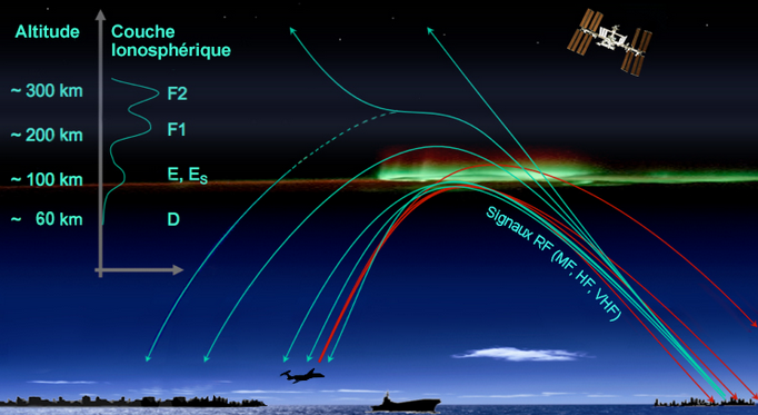 La propagation des ondes radioélectriques sur de longues distances dans l’atmosphère terrestre est liée à ces couches ionosphériques. Par temps calme le jour, les ondes radios très basses fréquences (VLF) et hautes fréquences (HF) envoyées depuis la terre, traversent la couche D, rebondissent généralement sur la couche E de l’ionosphère, puis sont renvoyées vers la terre ou elles rebondissent à nouveau vers la couche E, permettant ainsi leurs propagations sur de longues distances. A plus hautes fréquences, comme en VHF, les propriétés de réflexion seront surtout utilisées en couche F.
